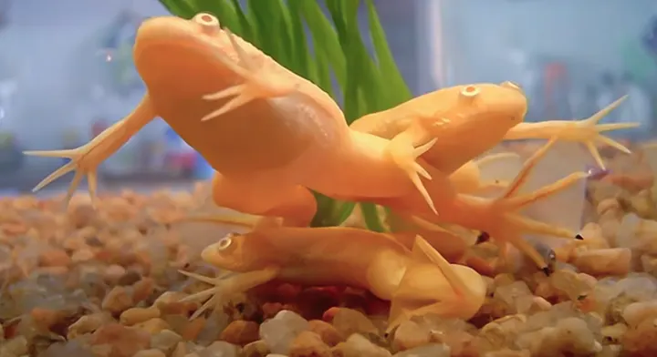 La rana albina acuática es un anfibio exótico de color blanco-rosado, muy popular en acuarios por su apariencia llamativa y comportamiento curioso.